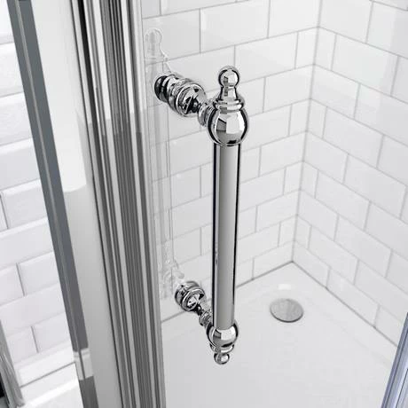 The beautifully crafted Chatsworth sliding shower door enclosure, featuring 6mm toughened safety glass with classic ball headers on the top of the frame posts and a elegant traditional style door handle. Supplied with a quality 40mm high white acrylic capped shower tray, constructed from a polyurethane resin mixed with filler including volcanic ash. If you are looking for a stylish designer look in your bathroom then our Chatsworth traditional shower enclosure range is the perfect choice.